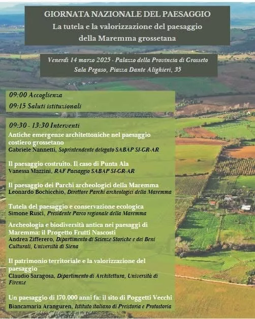 I Parchi archeologici della Maremma e la Soprintendenza Archeologia Belle Arti e Paesaggio per le Province di Siena, Grosseto e Arezzo venerdì 14 marzo 2025 organizzano e promuovono la giornata di studi “La tutela e la valorizzazione del paesaggio della Maremma grossetana” in occasione della Giornata nazionale del Paesaggio 2025, istituita nel 2016 con lo scopo di promuovere la cultura del paesaggio in tutte le sue forme e sensibilizzare i cittadini sui temi ad essa legati. Con il patrocinio del Comune di Grosseto, Parco regionale della Maremma e Ordine degli Architetti della Provincia di Grosseto.