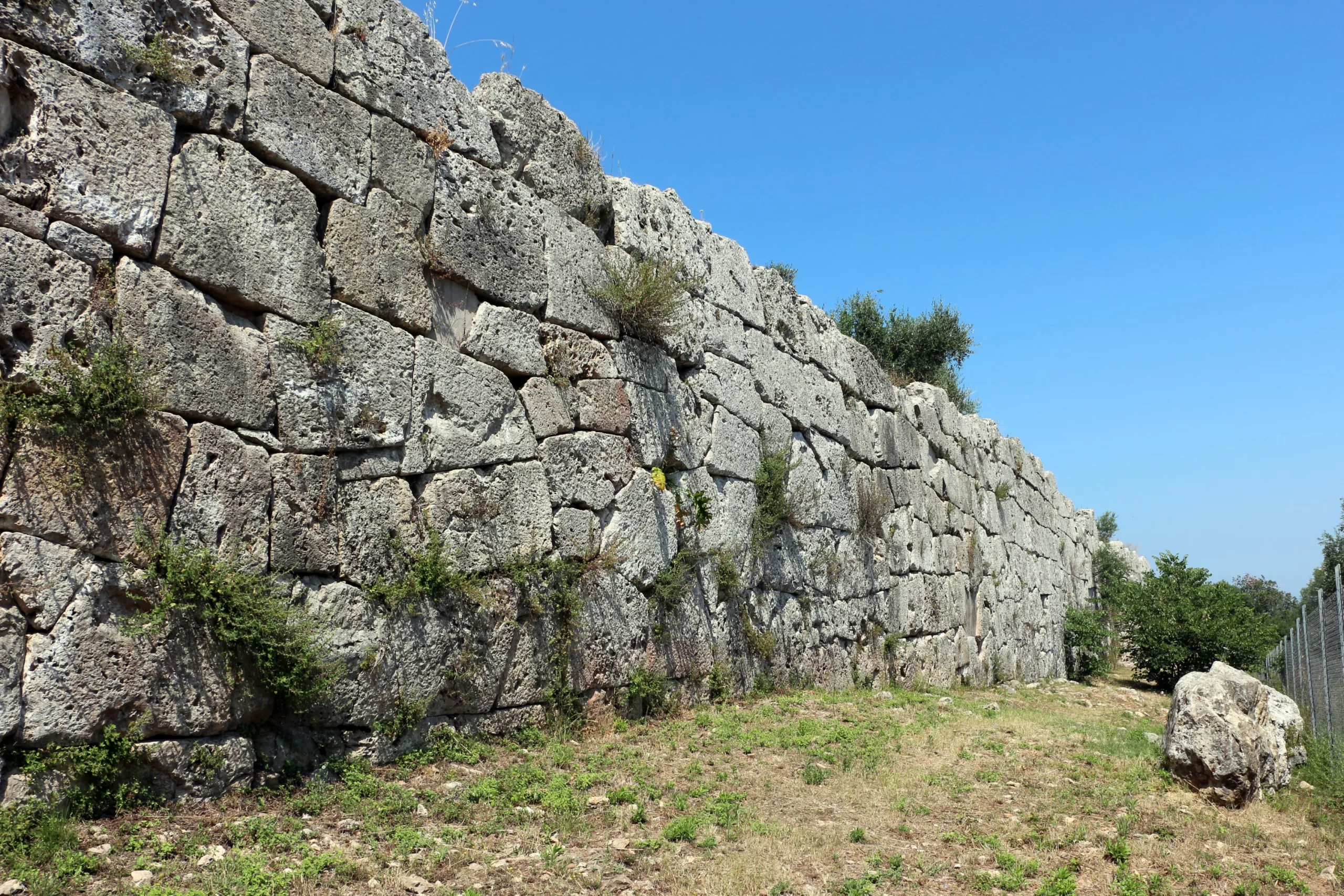 La cinta muraria di Cosa è uno degli esempi più imponenti e meglio conservati di fortificazione in opera poligonale in Italia. Lunga circa un chilometro e mezzo, avvolgeva completamente la colonia, proteggendola dagli attacchi provenienti sia dall’entroterra che dal mare. La sua straordinaria resistenza si deve alla tecnica delle mura poligonali: enormi blocchi di pietra venivano sagomati con precisione e posati senza malta, incastrandosi perfettamente come in un gigantesco puzzle di roccia. Questo metodo conferiva alla struttura un’eccezionale stabilità, tanto che ampi tratti sono ancora perfettamente leggibili dopo più di duemila anni.