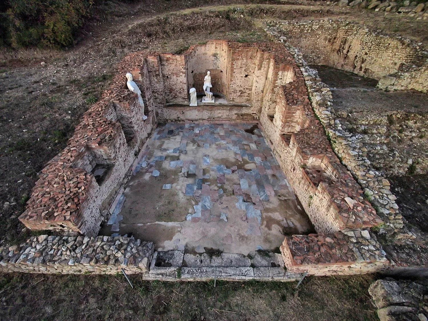 Tra gli edifici tardo-repubblicani e imperiali spicca la cosiddetta Basilica dei Bassi, forse sede del senato locale, con abside, nicchie marmoree e sculture familiari, oggi ricostruite in copia.
